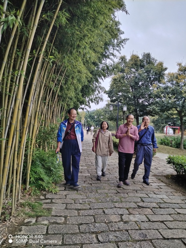 下午,老同志们来到位于“国家森林公园”老山脚下的“不老村”参观。不老村环境优美,空气清新。喜看稻菽千重浪,抚今追昔看盛世:正是有了革命先辈的艰苦卓绝的努力,才有了富强的中国。老同志们漫步于社会主义新农村,看到有“营地”字样和椭圆形围着的栈道,想到和平安宁的节假日中“乡村游”为主的经营方式,感慨万千——如今的幸福生活来之不易!