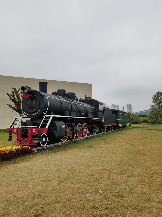 中央绿地上按1:1比例复原中国自主设计制造的第一辆客运蒸汽火车——解放号火车的车头及第一节车厢。