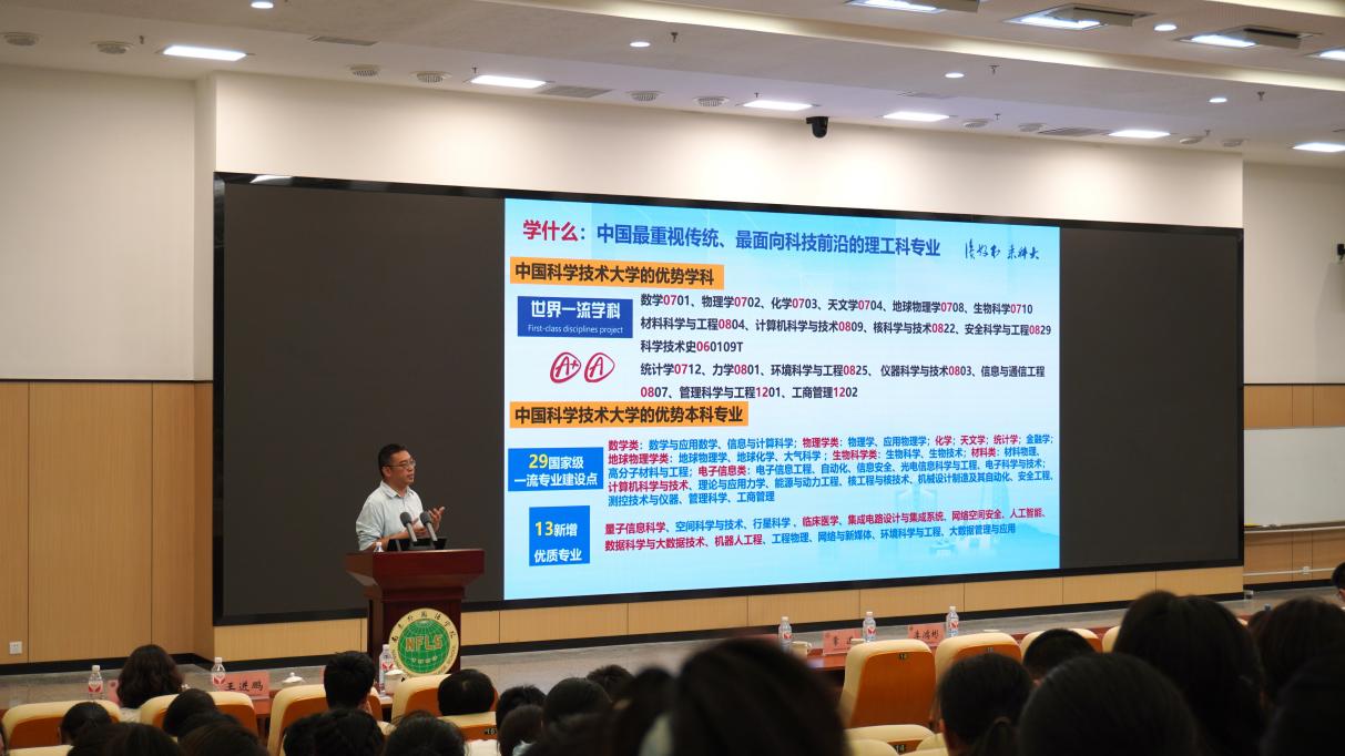 中科大招生办主任王浩波进行了招生宣讲。一句简洁有力的“读好书,来科大”,点燃了同学们的热情。王主任详细介绍了科大的光辉历史、独特的人才培养模式、明确的培养方向以及完善的选拔体系,鼓励“有理想、有天赋、有志向”的中学生积极报考科大,投身于科学探索的伟大事业。