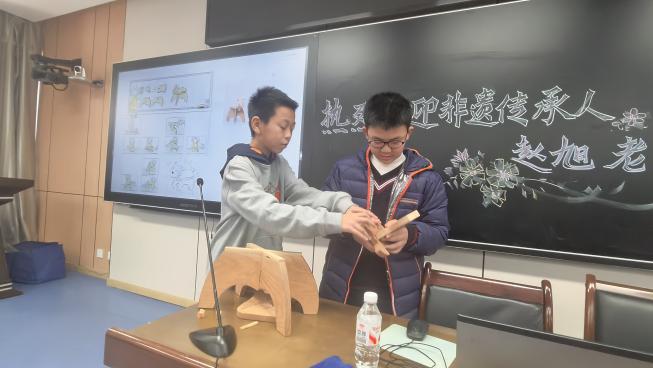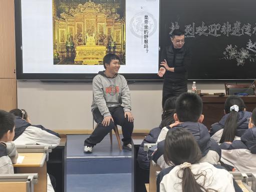 讲座不仅注重知识传递,更强调互动体验。在有奖竞猜环节,同学们踊跃参与,赢得了赵老师特地从北京故宫带来的明信片;有同学亲身体验了“坐龙椅”的感受,发现皇帝的宝座并不如想象中舒适;还有两位初一同学尝试按照图纸组装家具零件,深刻体会到传统榫卯结构中所蕴含的精密科学与工艺智慧。