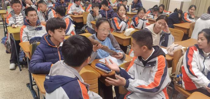 讲座尾声的互动环节让现场气氛更为活跃。第一个环节中,一名同学体验了模拟皇帝的小木凳,老师随后讲解,该木凳的设计核心并非舒适,而是彰显皇权尊严。第二个环节为木件鉴别,三件木件亮相后,多数同学倾向于外观最精致的一件,但其实际价值并非最高。老师强调,木料的价值在于它的历史背景而不是外貌,不少同学露出诧异表情。第三个环节里,三位初一同学上台组装小木凳,他们专注操作,仅用三分钟便完成组装,台下响起掌声。