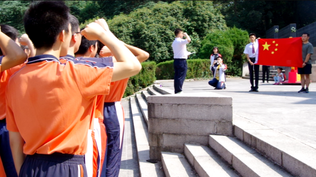 11点10分,宣誓仪式正式开始。抗日航空烈士纪念碑前,明亮的阳光和高远的蓝天,衬得五星红旗格外耀眼夺目。同学们右手握拳,面向国旗,庄严宣誓:“我志愿加入南京外国语学校国旗班,接受爱国主义教育,增强爱国主义情感。心系祖国,热爱人民,继承和发扬国旗班精神,以我火热青春,谱写国旗礼赞,用我生命热忱,捍卫国旗尊严!”不同的嗓音,一样的热血,荡漾在山谷中,逸散在阳光里。
