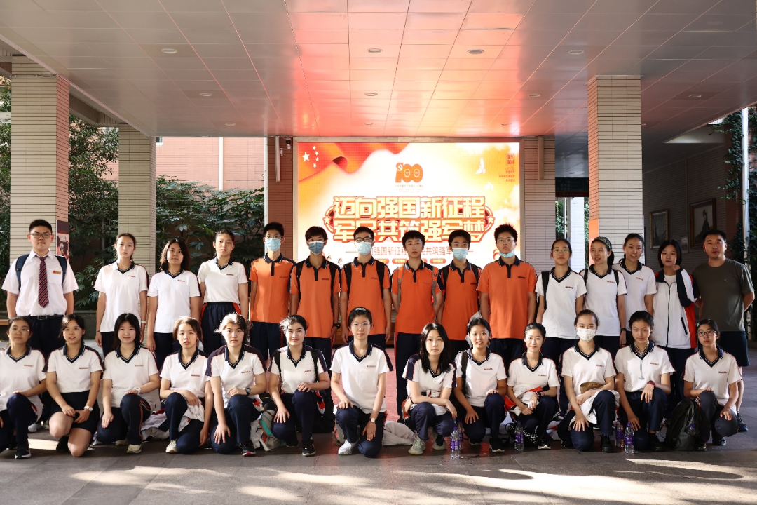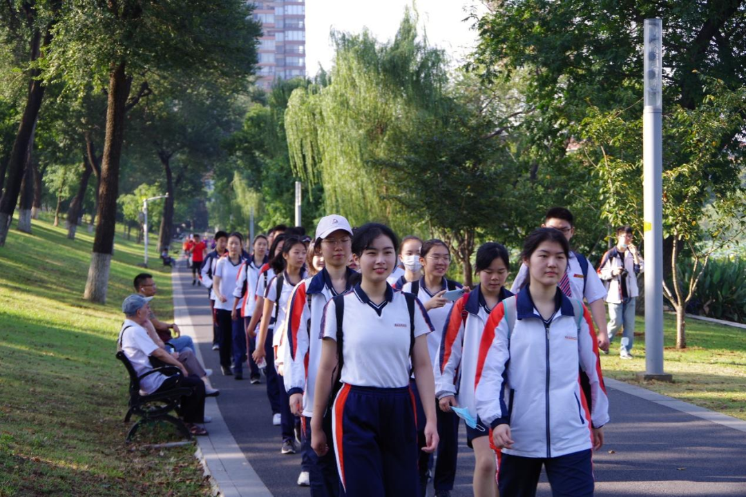 高一国旗班军姿准备,两路纵队,从南京外国语学校本部出发,途经玄武湖、岗子村、板仓街、蒋王庙街、老宁栖路,历时一个半小时到达南京抗日航空烈士纪念馆。国旗在前方飘扬,同学们身着校服跟在后面,阳光之下,不论走到哪里,都是最靓丽的风景。