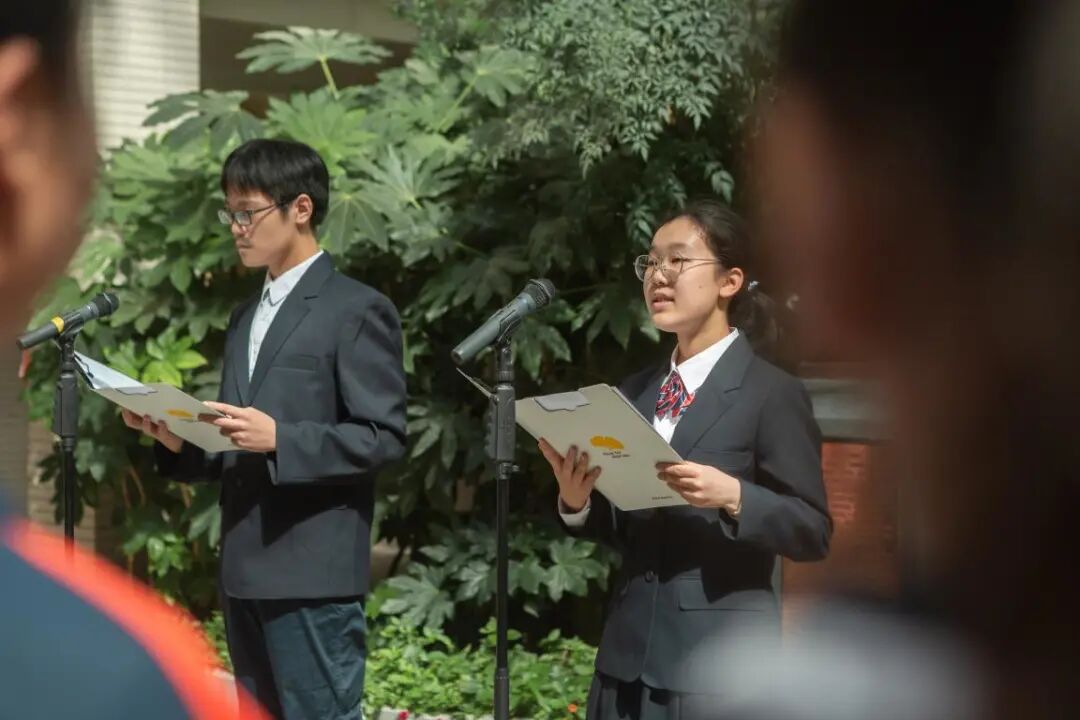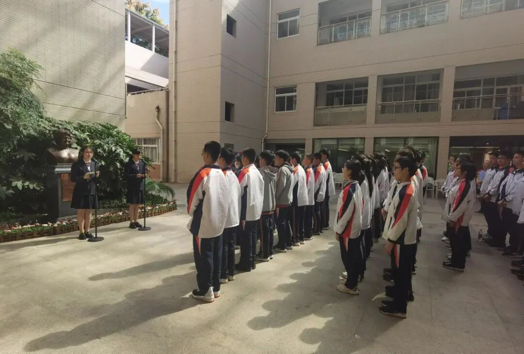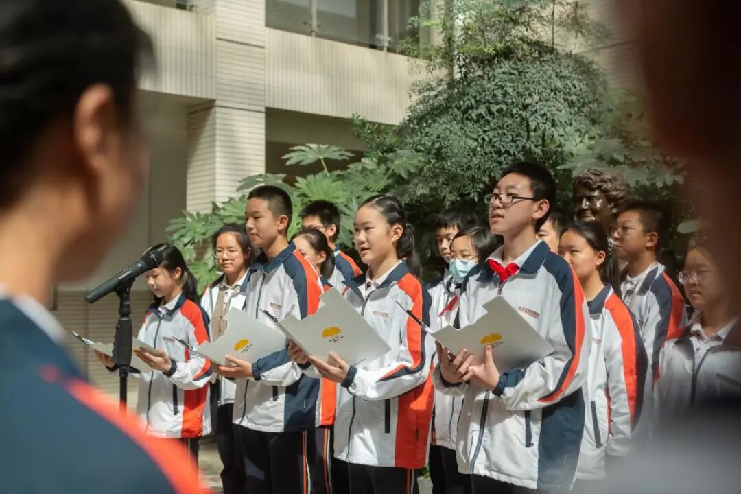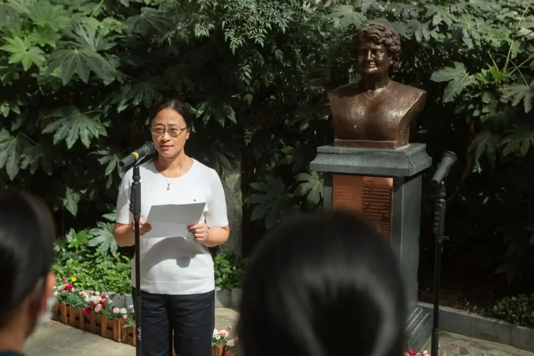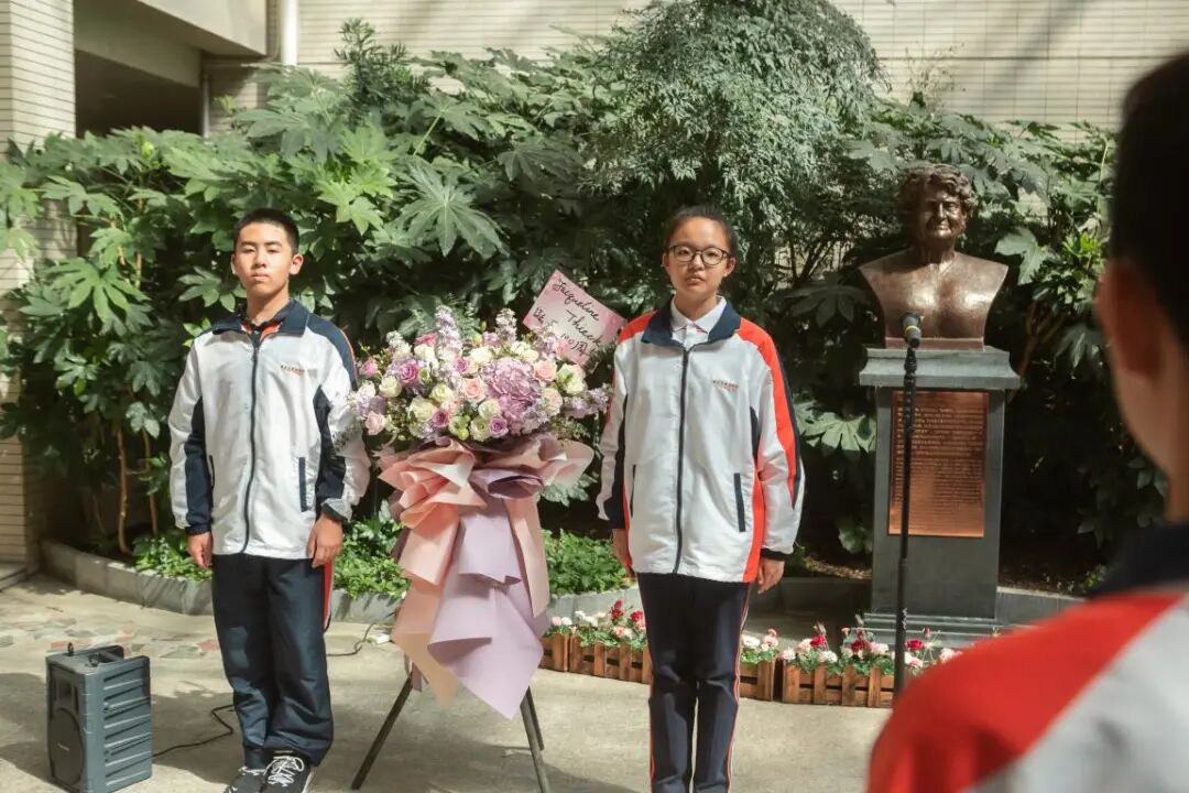 同为雅克琳任教时期的南外学子,林沁副校长从一位“隔壁班学生”的视角描绘了她眼中的雅克琳:“虽然我不是法班的一员,但是全校师生无人不知雅克琳老师,如果要用三个词形容她,那就是——美丽、敬业、大爱。”仪式的最后,初一学生代表在雅克琳老师的雕像前敬献花束,以表追思。