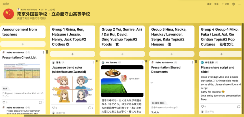 活动开始前,我校同学已经将自我介绍与精挑细选的个人相片贴在了padlet公共展板上,日本的同学也晒出了亲切热情的自我介绍视频。和异国的同学初次见面总是会有些紧张,大家在内心共同愿望的驱动下,逐渐打开了话匣子。同学们从生活聊到爱好、理想,从学校聊到家庭、家乡……相隔的屏幕与飘忽不定的网络信号都没有减少大家的热情。