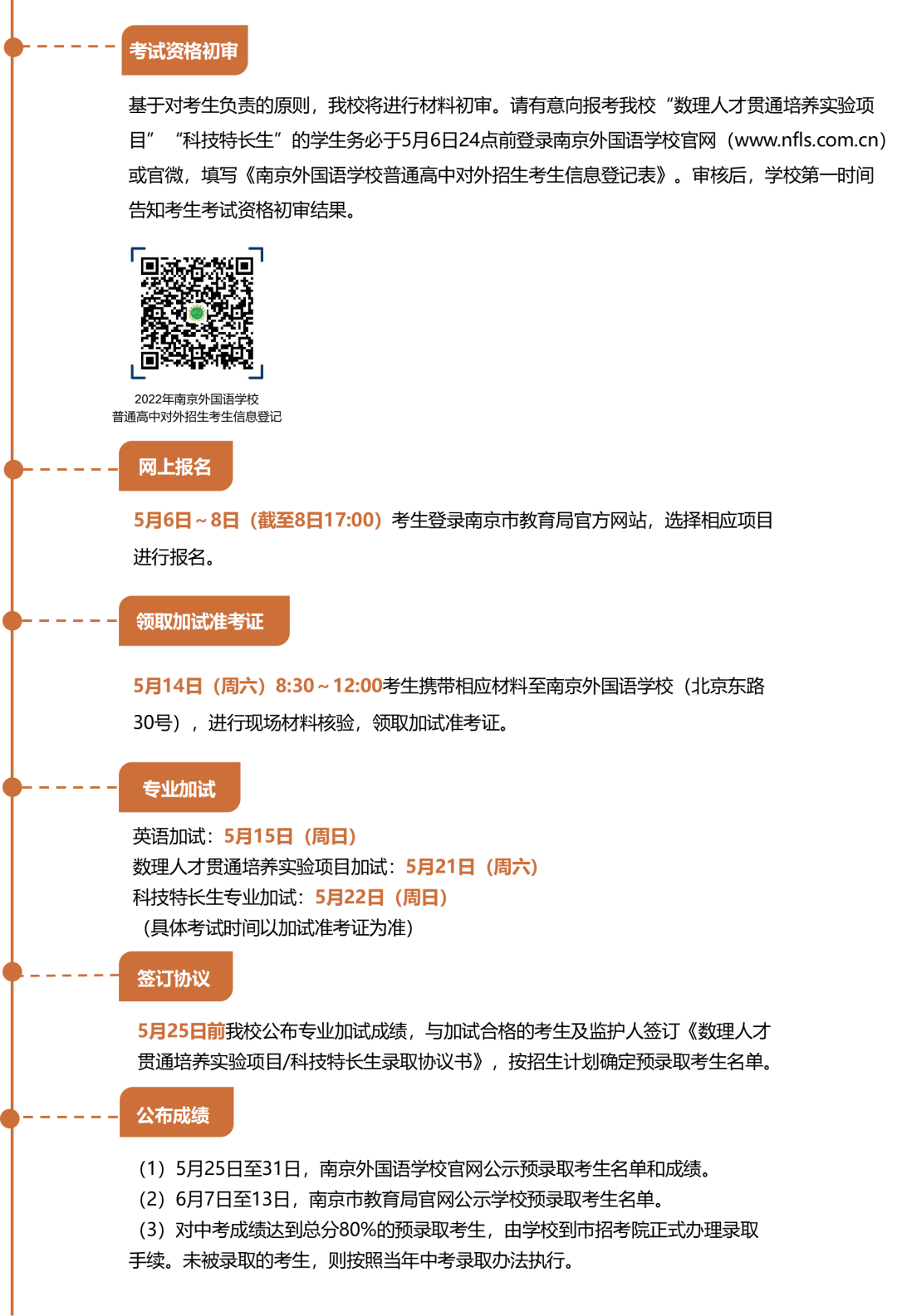 2. 基于对考生负责的原则,我校将对报考“数理人才贯通培养实验项目”“科技特长生”的考生进行材料初审。请考生及时填写《南京外国语学校普通高中对外招生考生信息登记表》,审核后,学校第一时间告知学生考试资格初审结果。