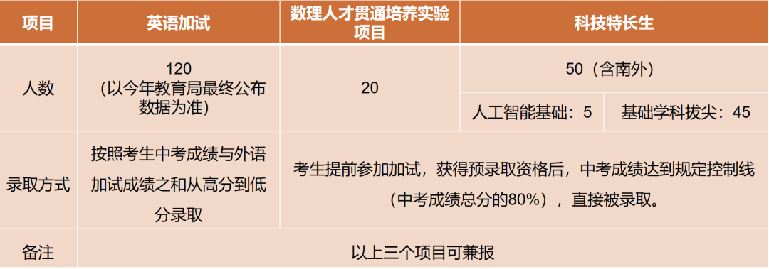 1. 南外普高对外招生共三个项目,一是通过“英语加试”方式拟录取120人(以今年教育局最终公布数据为准),该方式在中考报名的“提前批次”填报,所以“零风险”;二是通过“数理人才贯通培养实验项目”对外录取20人;三是通过“科技特长生”方式录取50人(含南外)。根据2022年市教育局相关文件要求,所有考生均可兼报我校的“英语加试” “数理人才贯通培养实验项目”和“科技特长生”。