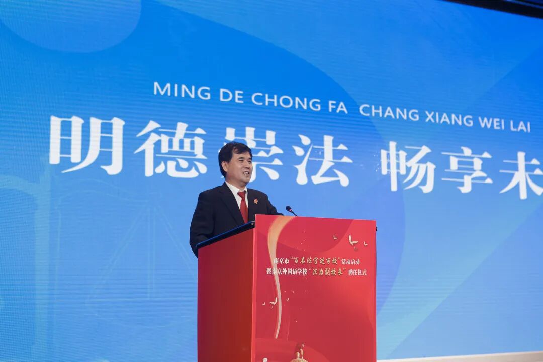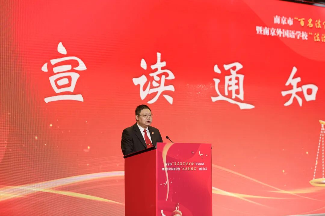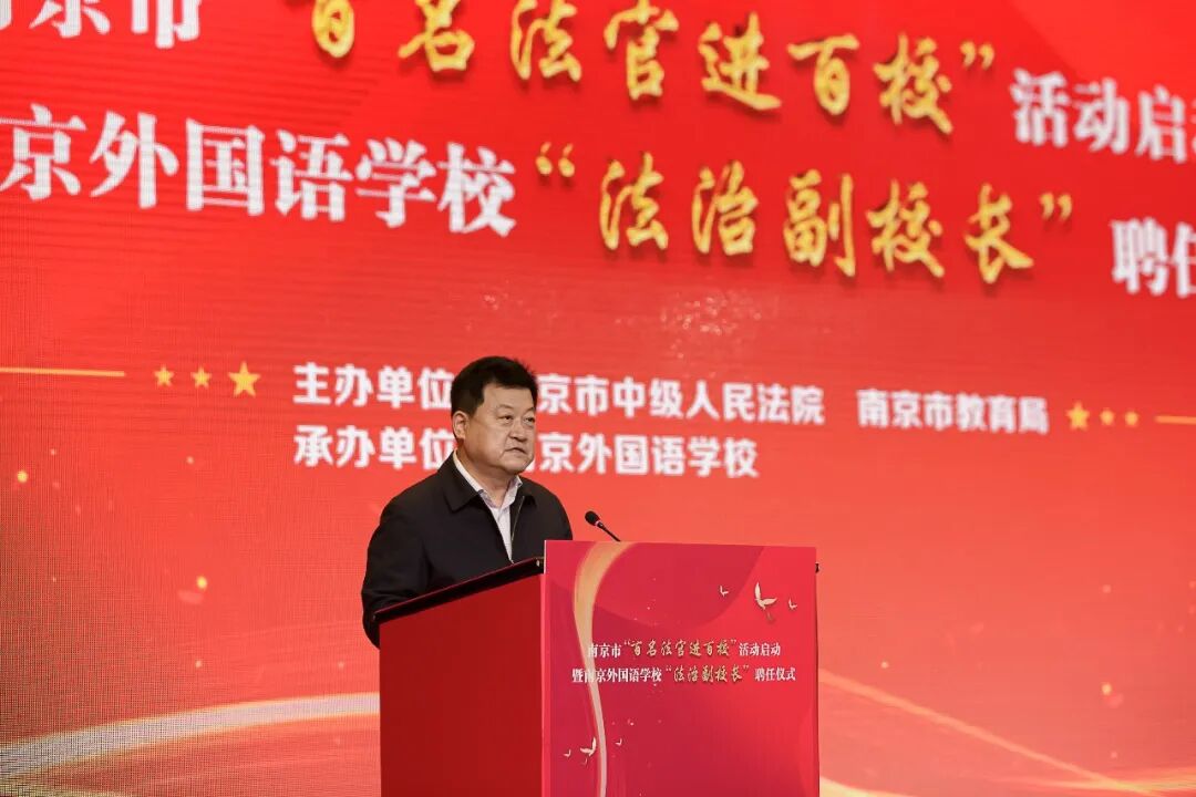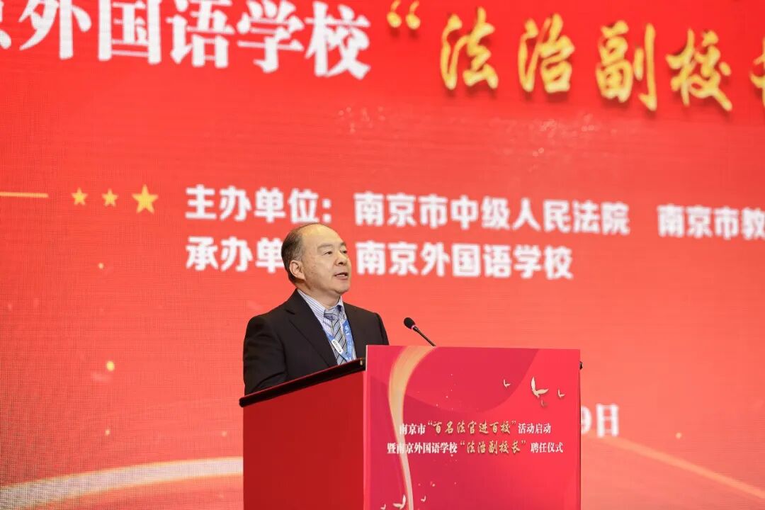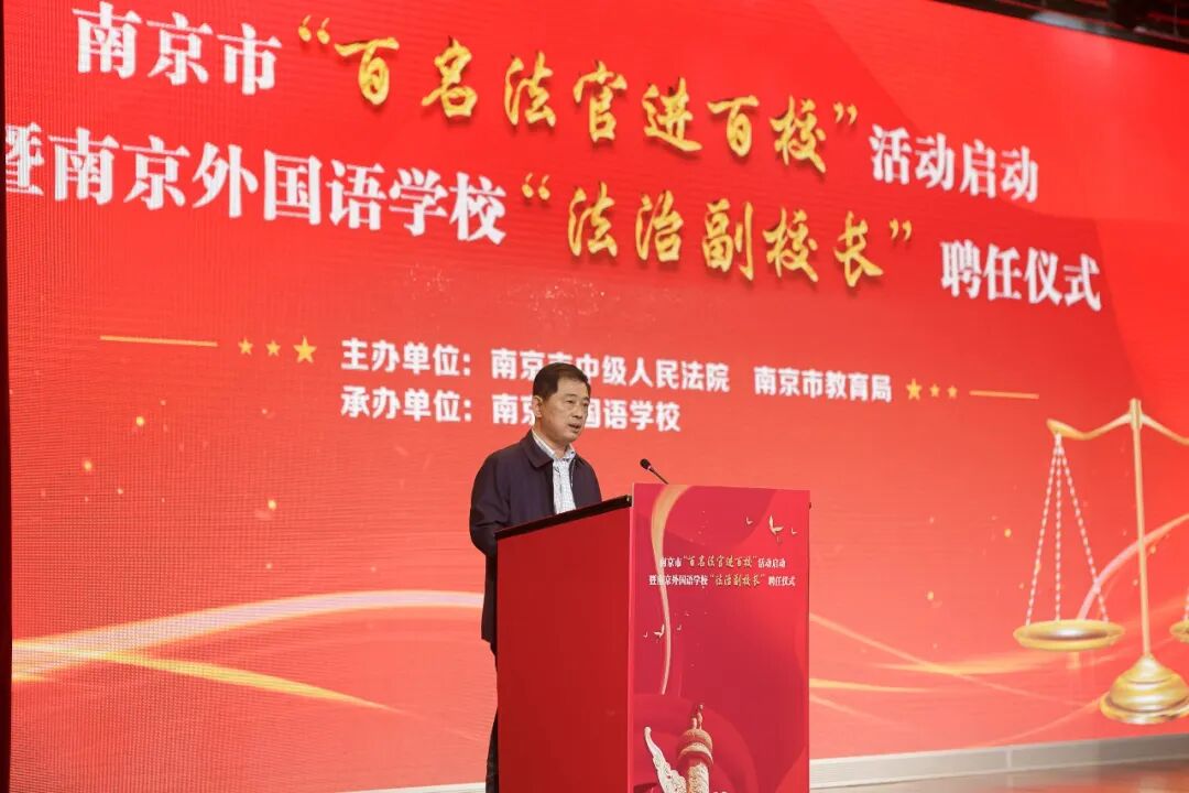 南京市中级人民法院党组书记、院长李后龙,市法院党组成员、副院长史俊;南京市教育局局长孙百军,市教育局一级调研员蒋希波;南京外国语学校校长邹正,校党委书记刘前树及师生代表共同参会。本次活动由市教育局一级调研员蒋希波主持。