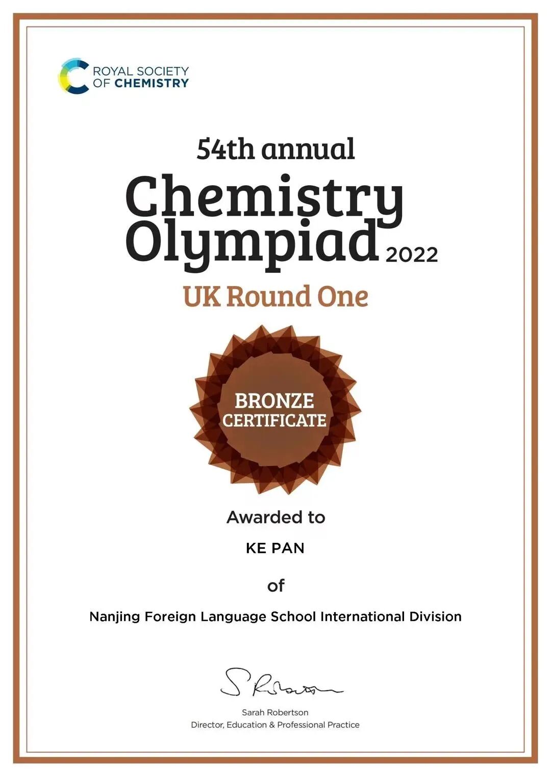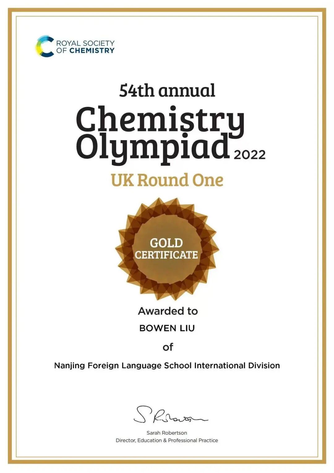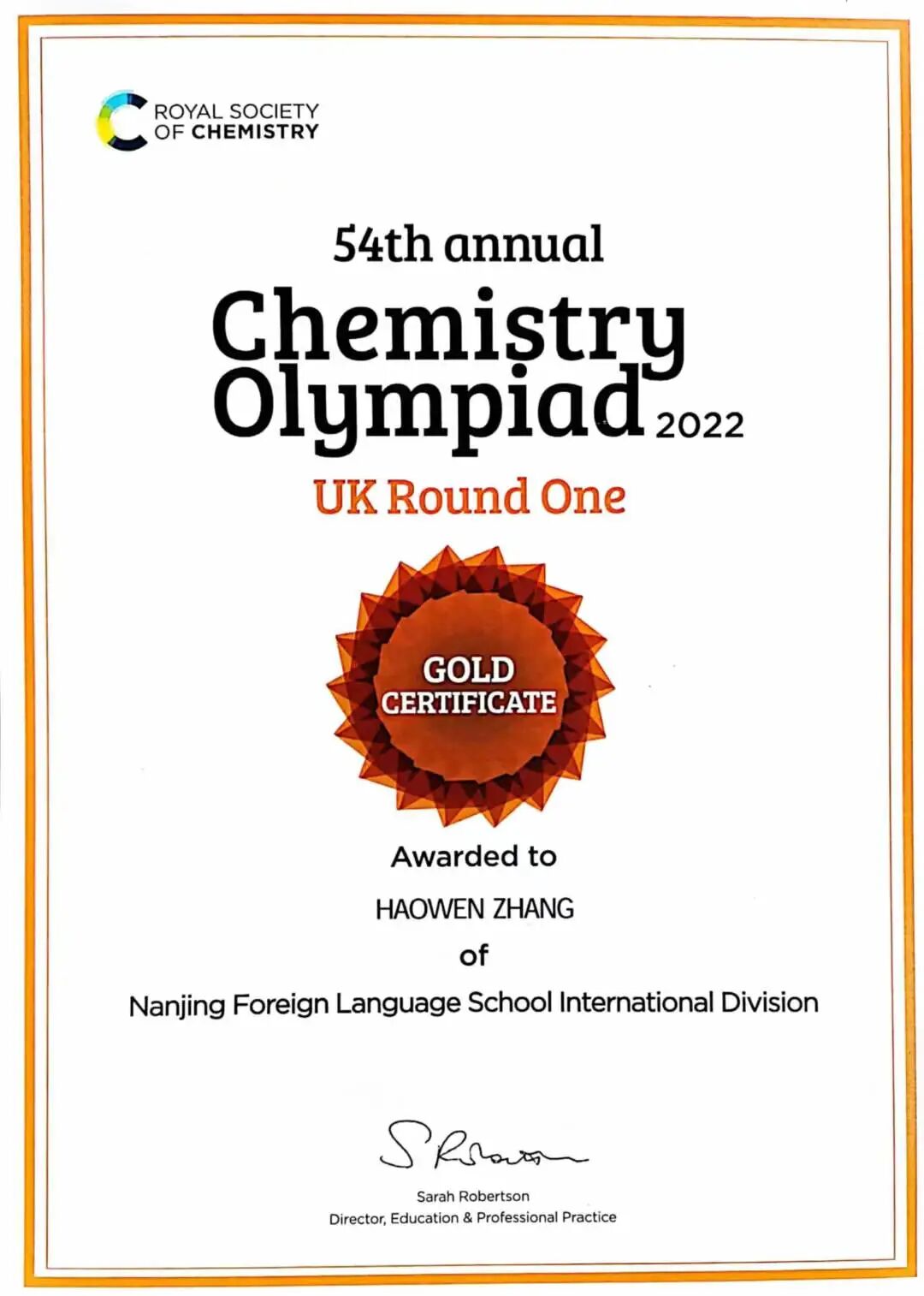 在2022年1月22日举办的英国化学奥林匹克竞赛(UK Chemistry Olympiad)中,南外国际课程参赛同学均取得优异成绩。6名同学获得金奖(Gold Certificate)、1名同学获得银奖、2名同学获得铜奖。