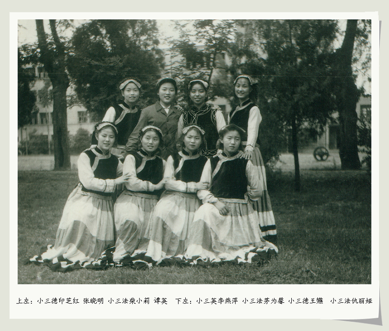 在这之前的一年,我们高一时,小四英德法学哥学姐们还在学校,我们三个班的女生已经有过一次联合演出,应该是在1972年5月23日前后,学校每年一次的文艺汇演上。演出的节目是舞蹈“洗衣歌”,我们穿着藏族服装,光着脚丫在学校礼堂的舞台上唱着跳着,那欢快的旋律,跳跃的节奏;那同学们欣赏的目光,学校礼堂(兼饭厅)舞台下的掌声,场景与曹白瑞同学美文《难忘洗衣歌》里的描述无异。