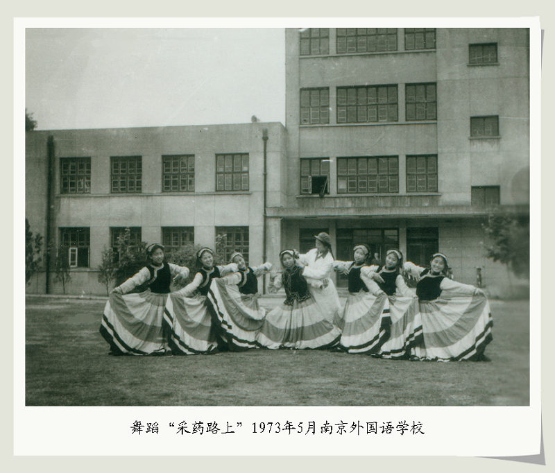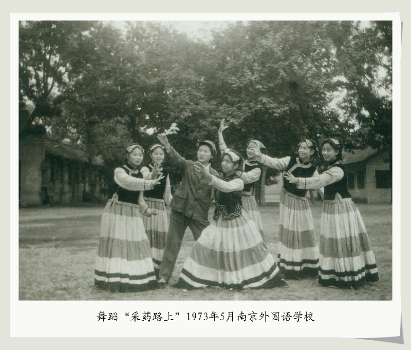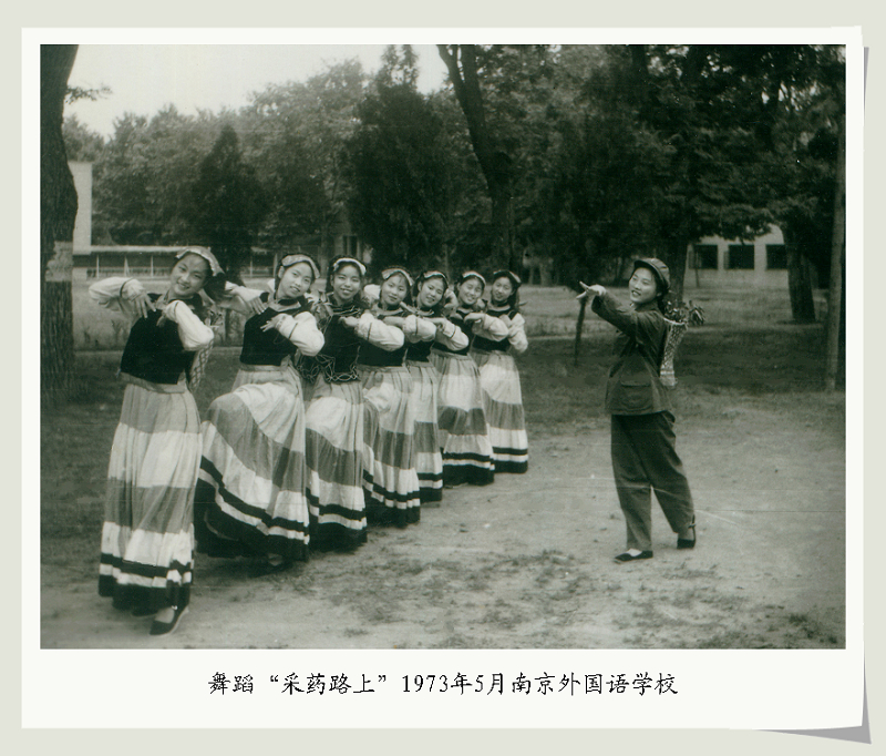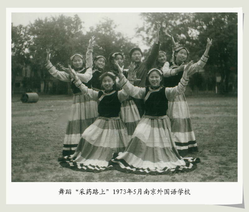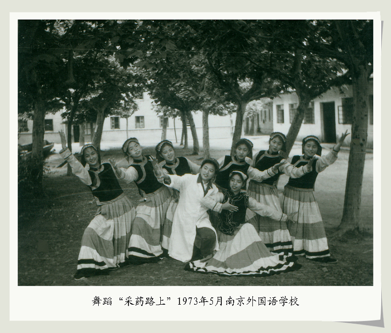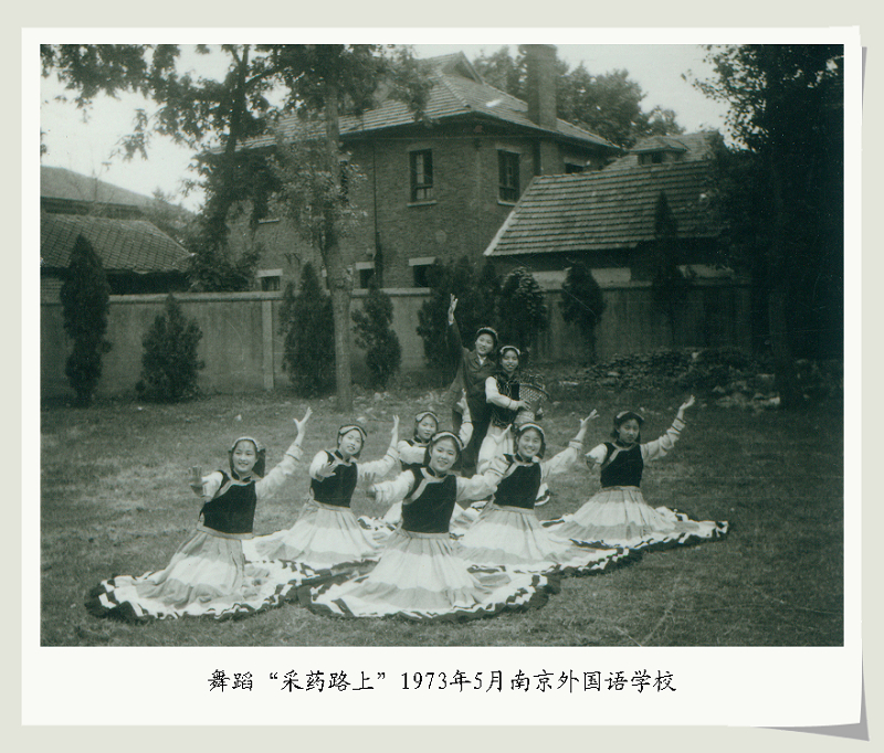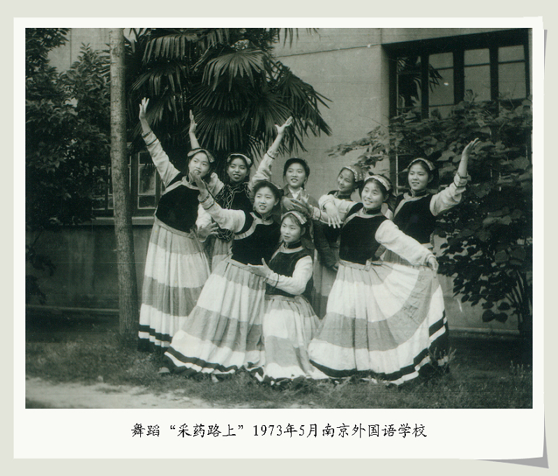 照片是1973年5月底在南京外国语学校的校园里拍摄的,我们刚刚结束参加南京市市属5所学校的巡回文艺汇演,好像汇演还进行了评比,好像我们的节目——舞蹈“采药路上”还获得了第一名?日记上没有写,所以记得不太清楚了。(由此看,笔记对记忆有多么重要。)从我摘录的相关内容的日记中,可以看出,当时的我没有时间写下具体的事项,因为要上课,要写作业,其中还有考试测验呢。