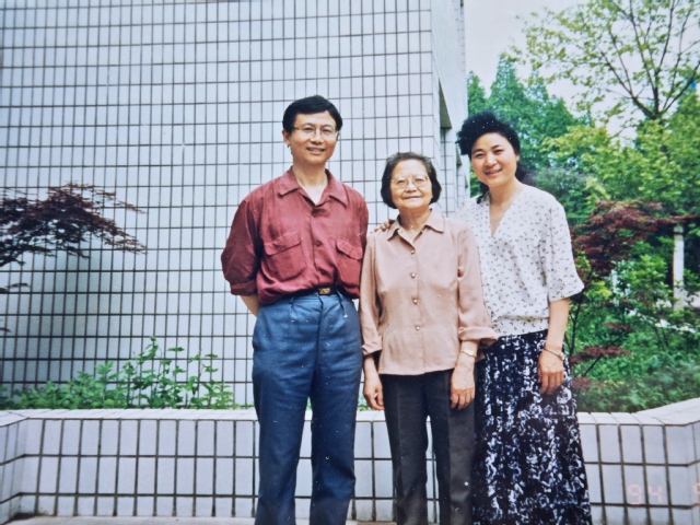 阎玉珍、吕鲁生校友夫妇与陈凤箫校长在校园内合影